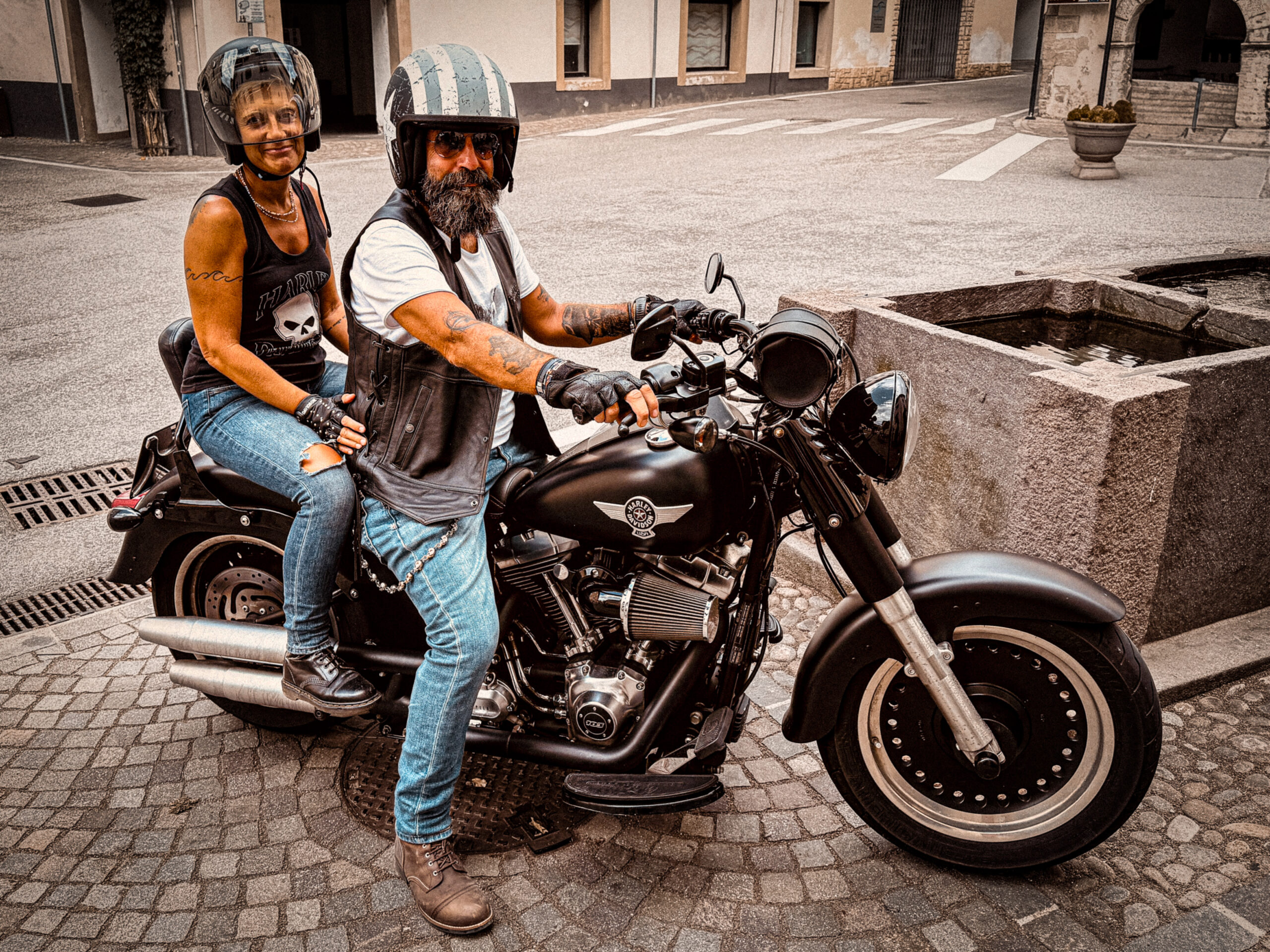 Amore a prima vista, un ritorno a quel piacere di guida rilassata, del vento addosso, senza carenatura che avevo provato con la BMW Cruiser che tendenzialmente aveva buoni numeri ma un grande difetto: non suonava. La FatBoy la senti rombare con i due pistoni del bicilindrico a V di Milwaukee di 1.700 cc che paiono colpi di fucile. La posizione di guida unica, ribassata, il manubrio largo, le pedane avanzate, le ruote enormi, la meccanica messa a nudo, essenziale, il cuoio degli accessori, quella unica enorme borsa laterale, i colori tra il nero e il grigio satinati e lucidi. Ma soprattutto quella scritta e quel logo inconfondibile che ti piazza immediatamente in una categoria di motociclisti decisamente particolare: gli harleyisti.
